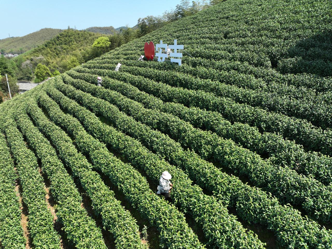 2024年4月9日,采茶工在安吉县上墅乡上墅村采摘白茶。图源 新华社