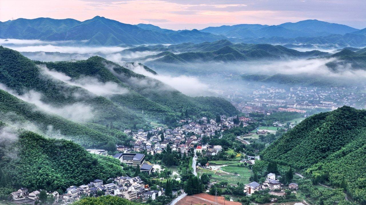 2024年6月24日,骤雨初歇,安吉县天荒坪镇余村,飘逸的云朵在竹海上升腾,民居与青山层叠相拥,构成一幅美丽的生态画卷。拍友 潘学康 摄