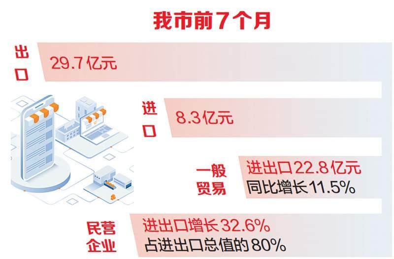 民营企业占比八成且活力进一步增强。前7个月,商丘市民营企业进出口增长32.6%,占商丘市进出口总值的80%。从外贸经营主体看,前7个月商丘市有进出口实绩的外贸企业数量318家,同比增长12.8%,净增加36家,其中民营企业305家,增长13.8%。