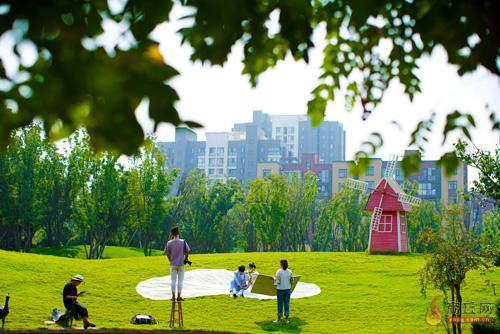 一对新人在城市绿地拍摄婚纱照。 本报融媒体记者 邵群峰 摄