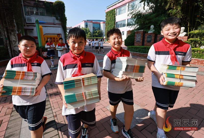 9月1日上午,在商丘市第一实验小学,学生们领到新书,开始了新学期的学习生活。据悉,义务教育三科统编教材(语文、历史、道德与法治)将在三年内覆盖所有年级。今年秋季学期,小学一年级和初中一年级使用;2025年,小学一、二、三年级和初中一、二年级使用;2026年,义务教育阶段所有年级全部完成替换。