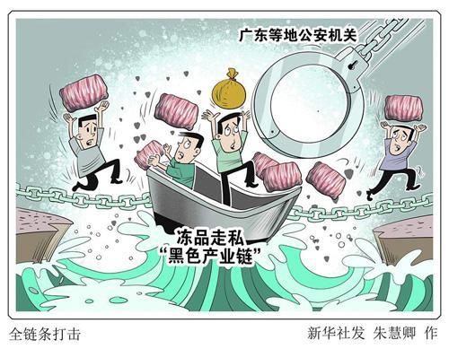 2023年9月,广东、四川、重庆、广西、北京、浙江、河南公安机关和香港警方同步收网,一举抓获包括组织者在内的涉案人员218名,捣毁走私冻库、仓库窝点21个,依法查处国内相关食品加工企业14家,查扣走私船艇26艘、冻品1300余吨。