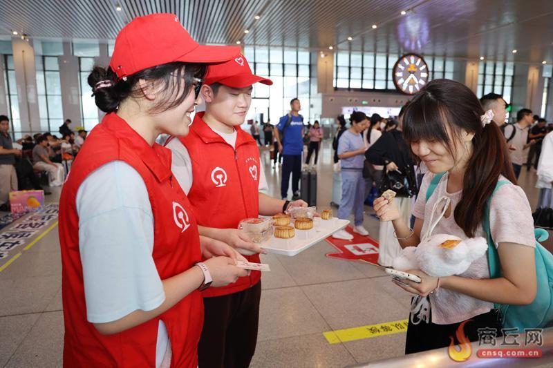 9月16日,商丘火车站在高铁站候车室开展“乐享旅途 情满中秋”文明出行主题活动。志愿者们分批次为旅客发放美味可口的五仁、枣泥、红豆馅月饼,送上节日祝福小卡片,让旅客感受到中秋佳节的温暖,并为旅客讲解《铁路旅客文明出行倡议》,营造文明乘车、平安出行的氛围。