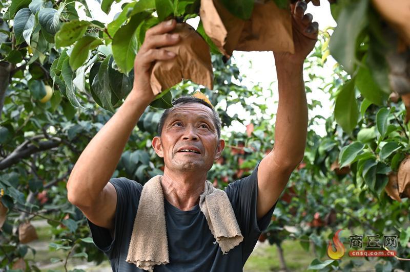 立秋过后,秋月梨便进入了成熟期。9月10日,在夏邑县太平镇三姓庄村谭家梨园,一个个硕大饱满的秋月梨挂满枝头。果农正忙碌于田间地头,采摘挂满枝头的果实,肩挑手提,一派繁忙景象。