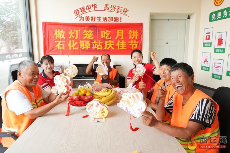 当日,“爱心驿站”内,中国石化河南商丘石油分公司志愿者提前将水果和不同馅料的月饼整齐摆放,供附近的环卫工人品尝,并和环卫工人一起制作玉兔花灯。大家一起裁卡纸、拼支架、搭外框、穿绳子、系提杆,不一会儿,一个个喜庆可爱的兔子花灯就大功告成了。