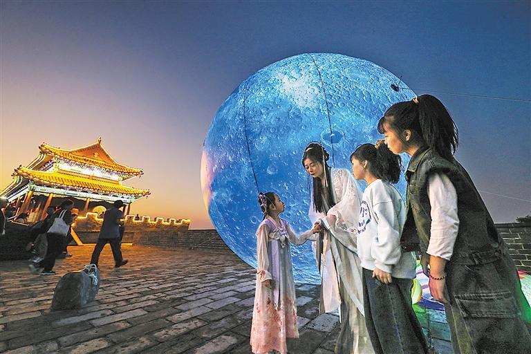 9月16日晚,彩灯超级大月亮在商丘古城南城墙亮灯,吸引了众多游客赏灯游玩与明月共舞。李恒 摄