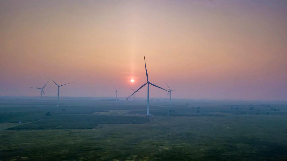 科尔沁大草原上,牛羊健硕。蓝天白云下,一排排巨型“风车”缓缓旋转,在古老草原上勾勒出现代的“天际线”。这里是内蒙古通辽市238万千瓦风电基地。