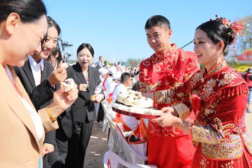 9月22日,在活动现场,参加集体婚礼的新人给观众分享喜馍。当日,2024年中国农民丰收节全国主场活动在河南省开封市兰考县举办。活动以“学用‘千万工程’ 礼赞丰收中国”为主题,现场组织了丰富多彩的群众庆祝丰收联欢活动,农民朋友与游客共话丰收,同享喜悦。