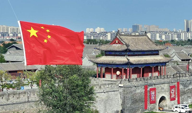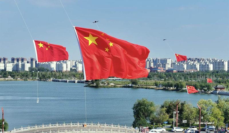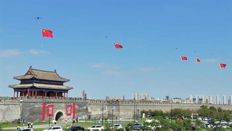 随着国庆节的临近,近日,商丘古城景区上空,数架无人机悬挂着国旗,在蓝天白云映衬下划出美丽的弧线,引得不少市民游客驻足观看。大家纷纷拿出相机和手机拍照纪念,分享节日的喜悦。