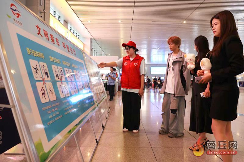 9月25日,中国铁路郑州局集团有限公司商丘车站志愿者为旅客讲解乘车安全知识。国庆长假即将来临,商丘车站积极开展文明乘车、平安出行系列宣传活动,向广大旅客普及铁路安全知识,提高其法律意识和安全防范意识,确保铁路运输安全和旅客出行平安。