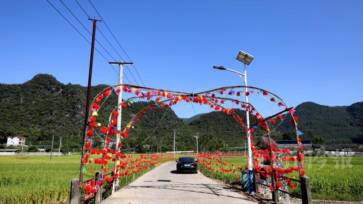 当天活动很热闹。村口立起来了简易拱门,还贴上对联,庆祝重阳节。道路两边张灯结彩,与两边金黄的稻田交相辉映,构成一幅祥和的画卷。当天外出工作的人员都返回村里,他们还排练了节目。活动设在村里的篮球场,群众汇聚一堂,观看表演、聚餐。