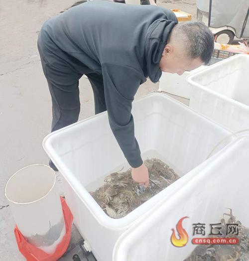“今年气温高,螃蟹产区放苗晚,上市也比往年晚了些,以往中秋节就到了销售旺季,今年到现在螃蟹才算成熟,但品质和以往一样好。”商丘农产品中心批发市场玉德海鲜负责人李鹏热情地告诉记者。他一边熟练地捏着螃蟹盖将螃蟹扔到桶内称重,一边向围观的顾客展示着自家螃蟹的“健硕身躯”。