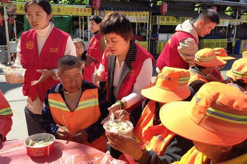 志愿者为环卫工人送上热气腾腾的饺子。 本报融媒体记者 邢 栋 摄