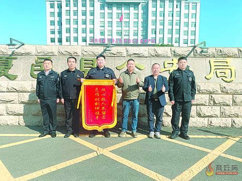 赵永生将锦旗送到夏邑县公安局李博(左三)手中