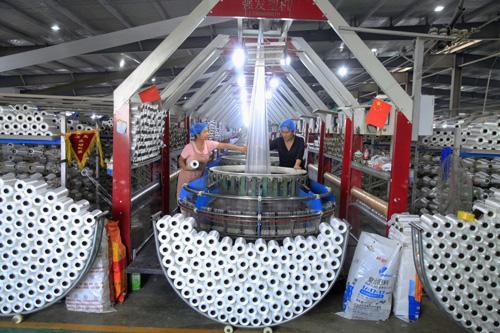 10月26日,位于宁陵县柳河镇的商丘市新鹏泰塑料编织有限公司车间,各条生产线开足马力满负荷生产,现场一派繁忙景象。该公司是柳河镇商会招商引资企业,中原地区塑编包装龙头企业,年产编织袋2.5亿条。 吕忠箱 摄