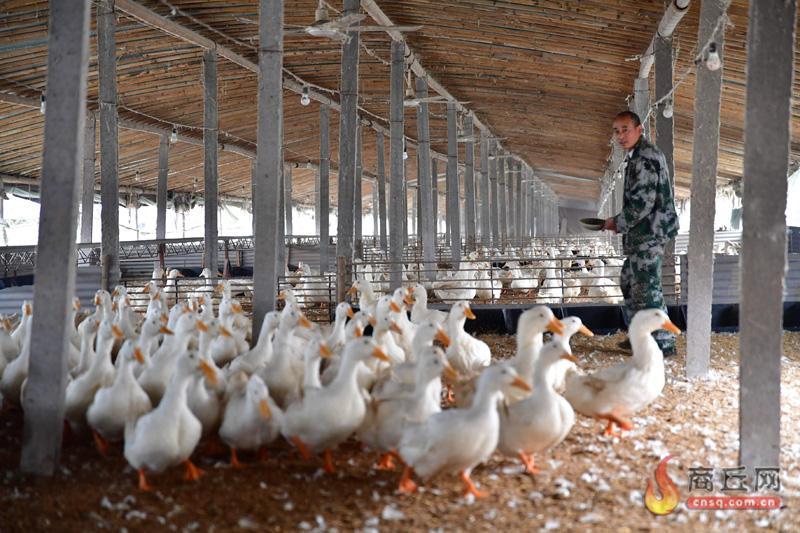 10月29日,夏邑县郭店镇柯针庙村村民正在给鸭子喂食。据了解,2017年,该镇引进全球最大的种鸭养殖企业——广西桂柳牧业集团,投资15亿元兴建广西桂柳牧业夏邑产业园,涵盖种鸭育种、饲料加工、父母代种鸭养殖、商品肉鸭养殖等,形成产业链条。目前,柯针庙村养殖种鸭23组6.9万羽,年利润额近2000万元。在柯针庙村的带动下,种鸭养殖迅速辐射到韩口、杨吕庙、骆天庙等20多个行政村,年产值10亿多元,净利润3亿多元,直接或间接从事养殖的脱贫户1000多户,仅种鸭养殖一项年人均增收6000元。