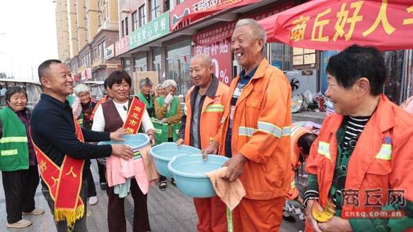 10月26日,在环卫工人节到来之际,柘城县春水街道徐园社区“商丘好人”李金亮夫妇专门为部分环卫工人送去脸盆、毛巾等慰问品,表达他们对环卫工人的敬意。 张 超 摄