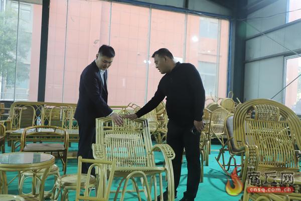 工作人员在宁陵县欧瑞工艺制品有限公司与相关负责人查看工艺制品。