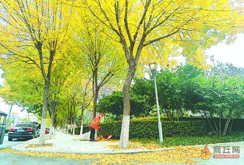 11月7日,在归德路与府前路交叉口附近,环卫工人正在清扫地面上的落叶。立冬过后,树叶逐渐变黄,落叶越来越多,环卫工人的工作量也在逐日增加。本报融媒体记者 魏文慧 摄