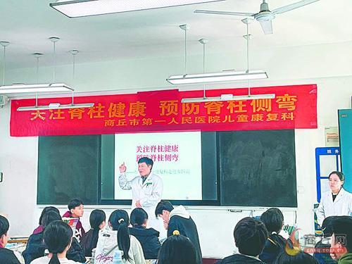 11月5日,市第一人民医院儿童康复科主任王久胜、护士长张雯,带领医护人员走进商丘市第四高级中学,开展预防脊柱侧弯科普宣传。经过两个多小时的努力,共为近200名学生进行了脊柱侧弯筛查。
