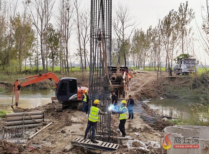 11月11日,睢阳区农村公路冯桥镇C094线高庙桥危桥改造项目施工现场,机械轰鸣、焊花四溅,桩基施工作业正在紧张有序进行,工人正忙着焊接桥墩钢筋笼,挖土机、泵车、吊车等在一旁随时待命。