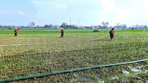 11月11日,柘城县起台镇吴庄村村民在麦田浇水。近年来,当地依托柘城县牧原农牧有限公司,利用沼液还田模式,每亩施用沼液3000公斤,替代10%以上的氮肥用量,实现养地壮苗、增产增收。张子斌 摄
