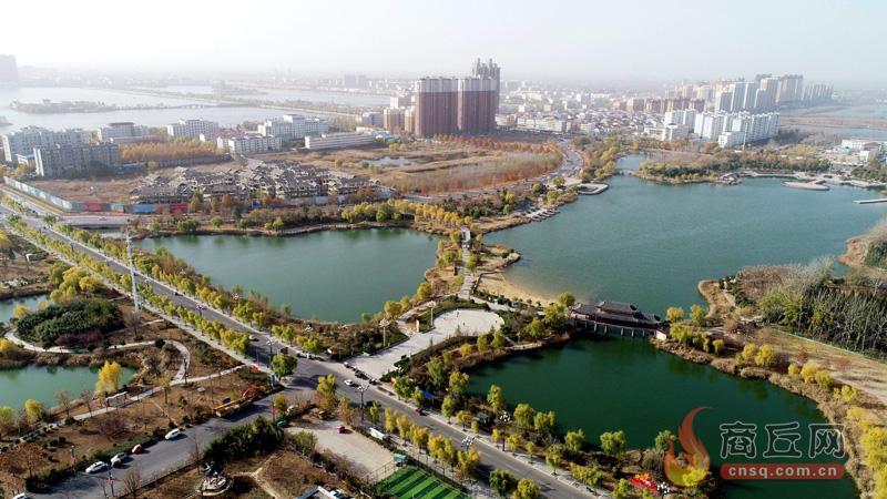 11月11日,航拍中原水城睢县。立冬节气过后,睢县恒山湖、北湖岸边植被红黄绿相间、建筑物错落有致,“城在湖中,城湖相间”构成中原水城独特的画卷。