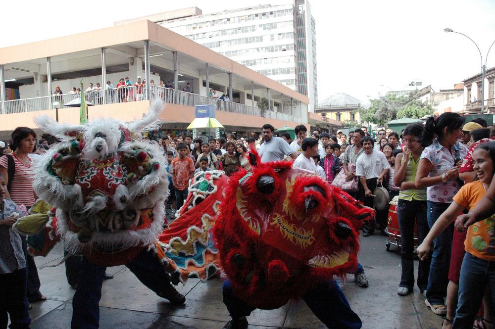 2006年1月28日农历除夕当天,华侨舞狮团在秘鲁利马唐人街上舞狮拜年。
