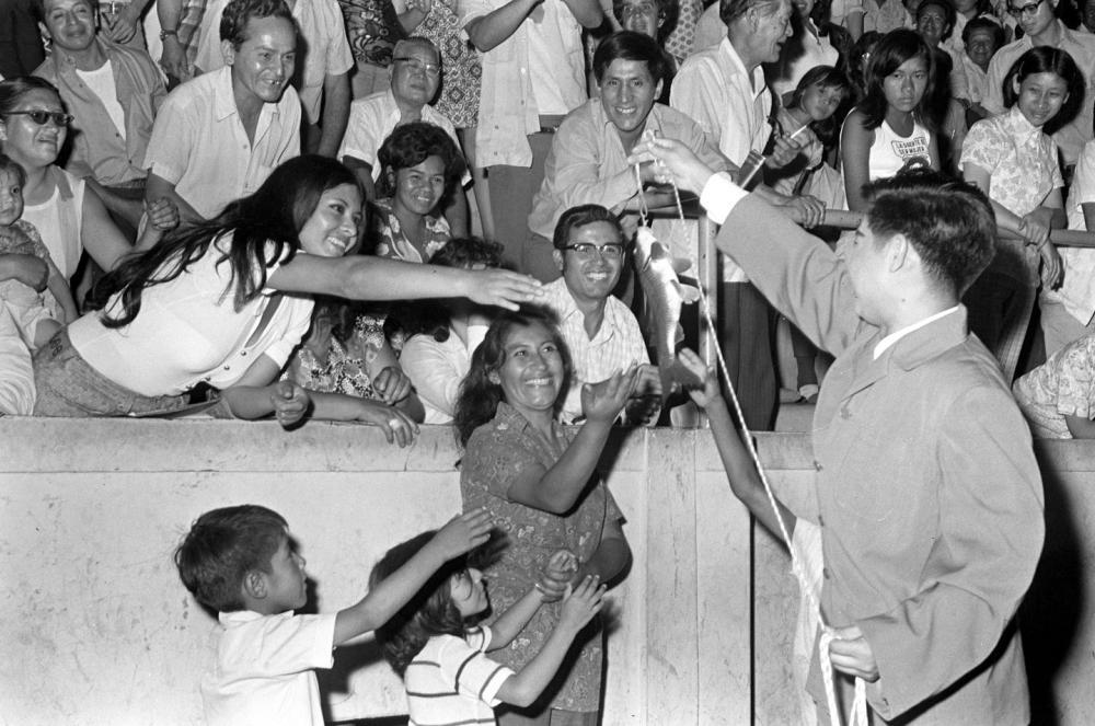 1973年2月,沈阳杂技团赴秘鲁进行友好访问演出。这是演员刘忠表演魔术《钓鱼》,受到秘鲁观众的热烈欢迎。