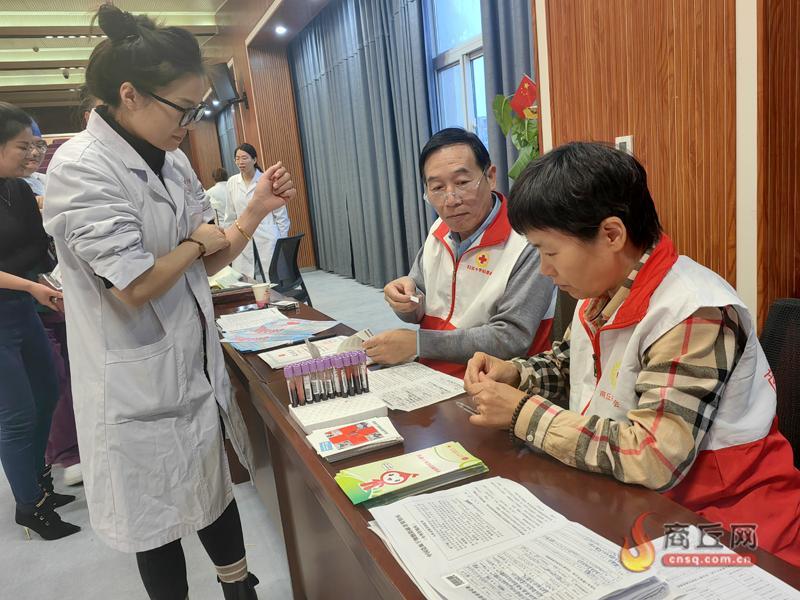 ▲市妇幼保健院医务人员(左)血样采集后进行中华骨髓库入库志愿者登记。