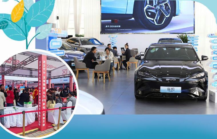 ▲睢阳区商丘永志比亚迪新能源4S店里消费者络绎不绝。 本报融媒体记者 邵群峰 摄 ◀睢阳区销售品“以旧换新”活动人气火爆。 本报融媒体记者 邵群峰 摄