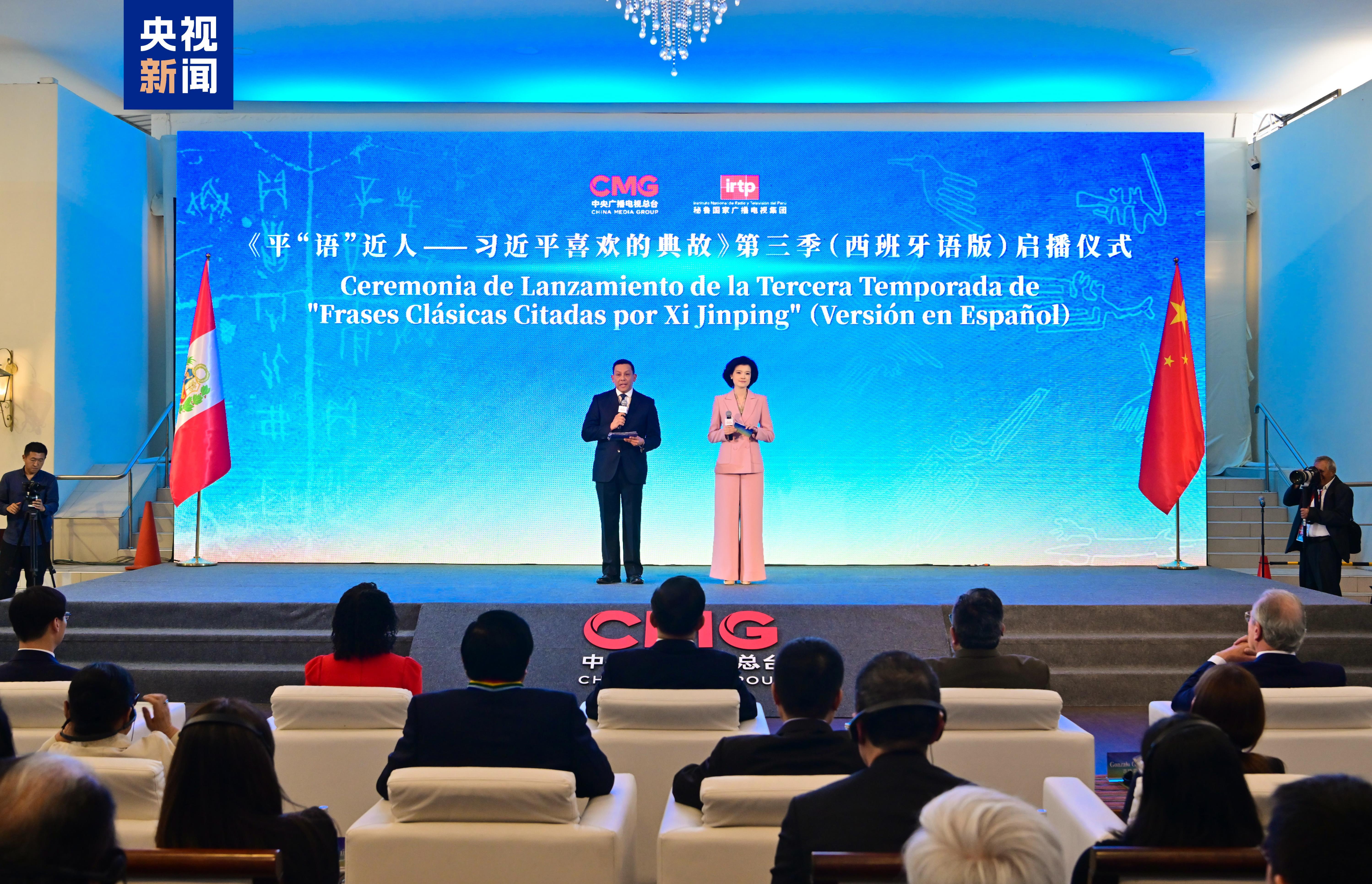 在中国国家主席习近平赴利马出席亚太经合组织第三十一次领导人非正式会议并对秘鲁进行国事访问之际,当地时间11月15日,由中国中央广播电视总台制作的《平“语”近人——习近平喜欢的典故》第三季(西班牙语版)启播仪式在利马举行。秘鲁总统博鲁阿尔特通过视频致辞对节目在秘鲁播出表示祝贺。秘鲁政治、经济、文化、媒体、学术等各界嘉宾近两百人出席活动。