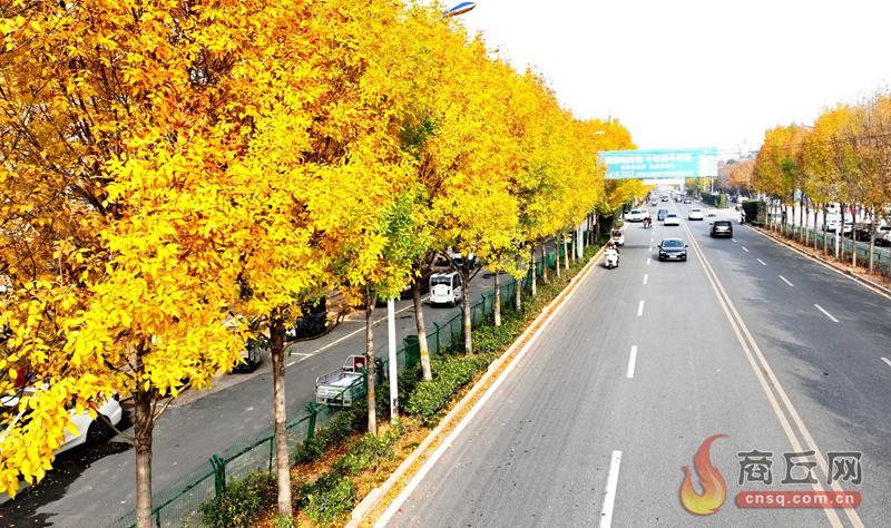 初冬时节,夏邑县城区的各大公园广场,多彩枝叶相互融合、映衬,把公园装点得五彩斑斓,处处美景如画。图为滨湖路两旁的树木已经换上了金黄色的“外衣”,一片片树叶在阳光下熠熠生辉,将整个道路装扮得如诗如画,引得居民纷纷驻足欣赏、拍照留念,感受这份冬日的温暖与美好。