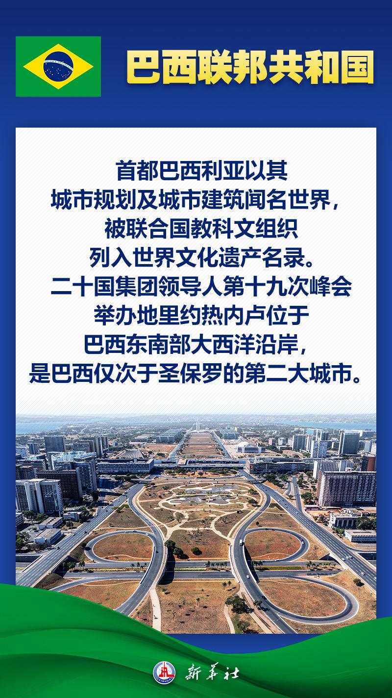 查看详情应巴西联邦共和国总统卢拉邀请,国家主席习近平11月17日至21日赴里约热内卢出席二十国集团领导人第十九次峰会并对巴西进行国事访问。巴西,拉美经济大国,自然条件得天独厚,矿产资源丰富,农牧业发达。作为拉美地区最大国家,巴西还有哪些特点,与中国关系如何?八张海报带你了解巴西——