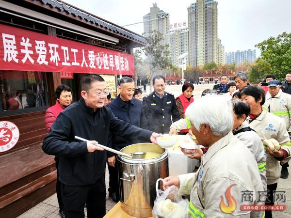 11月19日,民权县总工会在民生广场为环卫工人送来免费早餐。据悉,此项活动同时在6个片区进行,在一个月时间里为460余名环卫工人提供爱心早餐,此举让环卫工人倍感温暖。记者 闫鹏亮 摄