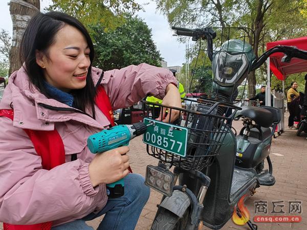 11月19日,我市中心城区电动车开始挂牌。在梁园区廉政广场电动车上牌点,梁园区运输事业发展中心工作人员为市民安装电动车牌。据悉,对于免费挂牌,市民反应热情,并积极配合电动车挂牌,各上牌点秩序井然。记者 邢 栋 摄