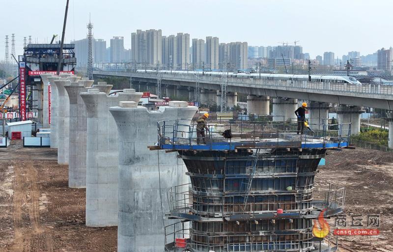 11月23日,在平原路与雄商高铁商丘段项目交会处附近,工人们正在高铁墩柱上作业。雄商高铁施工点距离商丘站越来越近。记者在施工现场了解到,曹商特大桥至梁园大道北段施工点,已经开始安装铁路护栏,商丘段项目进展顺利,预计2026年通车。
