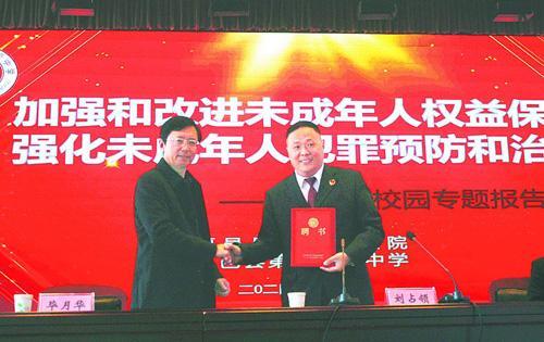 11月26日,夏邑县第一初级中学校长毕月华为该县人民检察院党组书记、检察长刘占领颁发法治副校长聘书。当天,刘占领率队走进该校开展以“加强和改进未成年人权益保护 强化未成年人犯罪预防和治理”为主题的专题报告会。本报融媒体记者 王 冰 摄