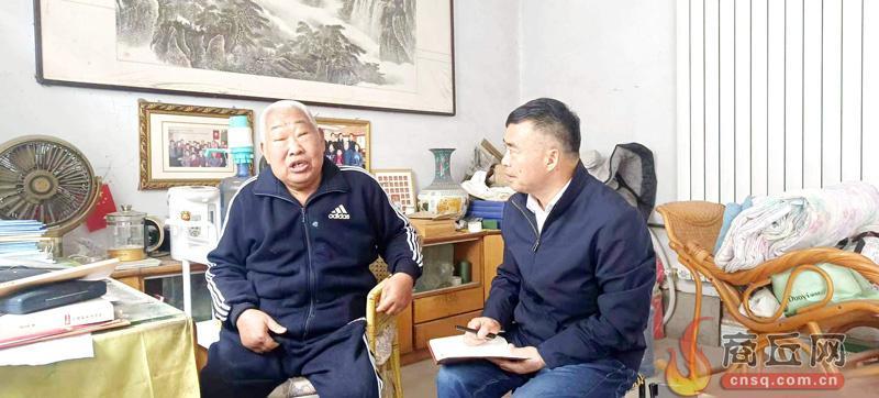 图②:闫鹏亮(右)采访退休职工。受访者供图