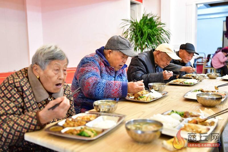 11月28日中午,在夏邑县城关镇松原公寓老年食堂里,30多名老人边吃边聊,其乐融融。
