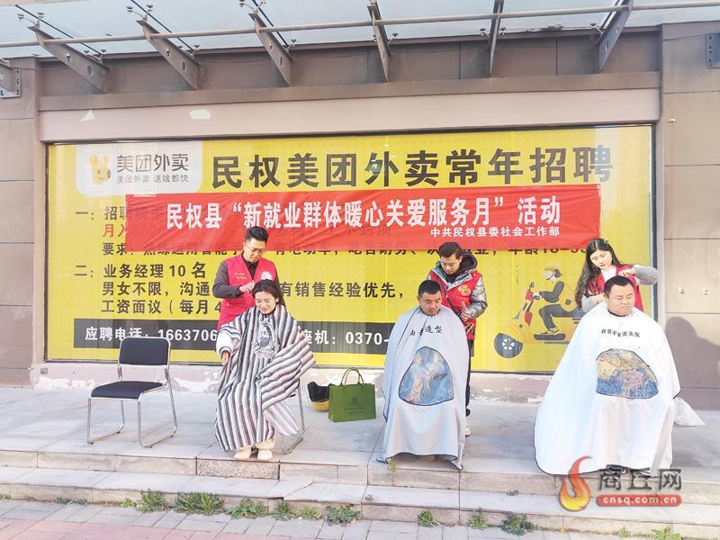 民权县“金剪子”文明实践志愿服务队队员为外卖员理发。 本报融媒体记者 闫鹏亮 摄
