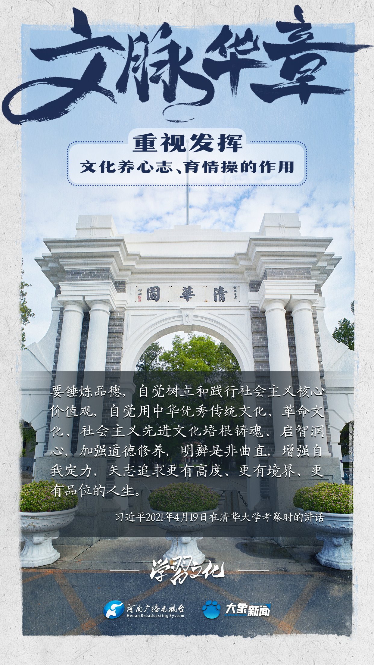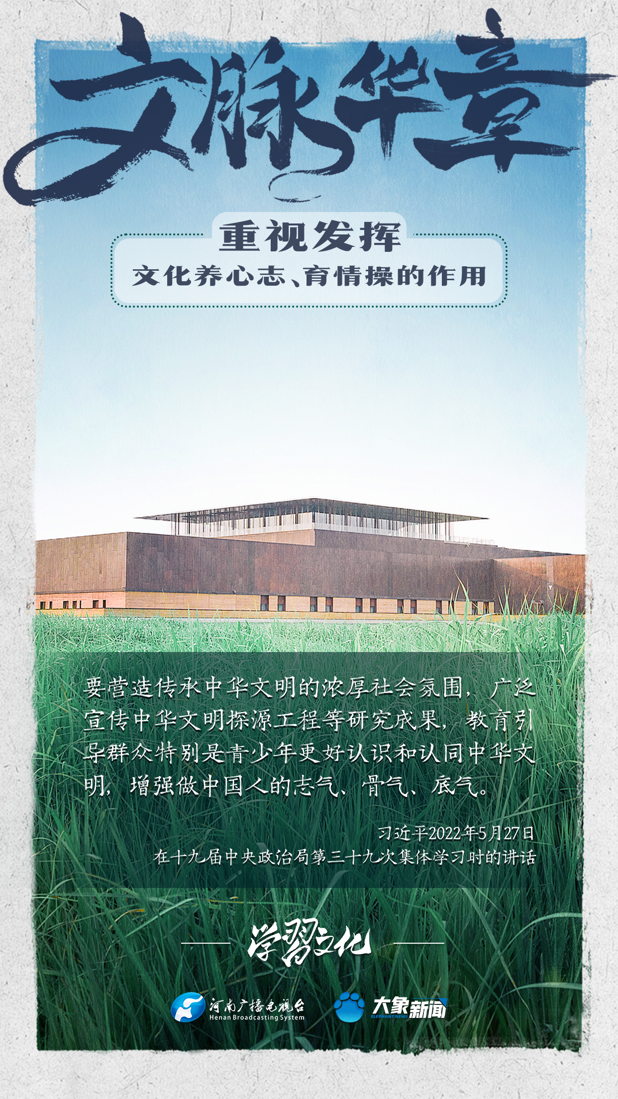 习近平总书记在主持中共中央政治局第十七次集体学习时强调,重视发挥文化养心志、育情操的作用,涵养全民族昂扬奋发的精神气质。总书记高度重视文化的作用,发表了一系列重要讲话,倡导以文载道、以文传声、以文化人。我们一起学习。