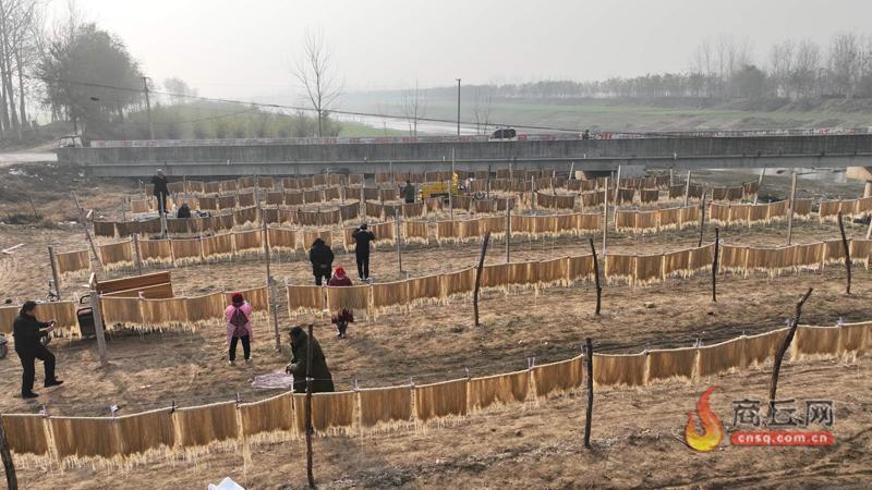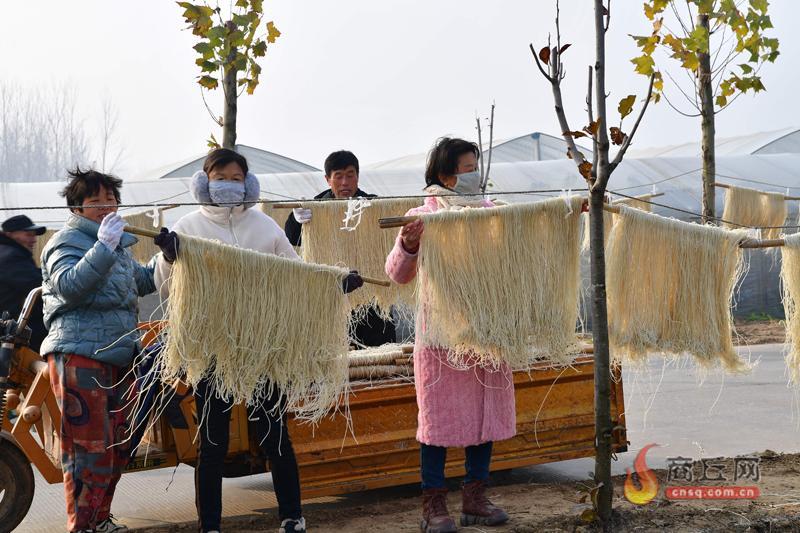 目前正值冬闲,农家传统手工粉条又迎来产销旺季。12月8日,夏邑县刘店集镇核桃园村晾晒场内一片繁忙景象,村民们正忙着晾晒手工粉条。一杆杆、一排排晶莹剔透的粉条整齐地悬挂在架子上,成为村间一道独特的风景线。