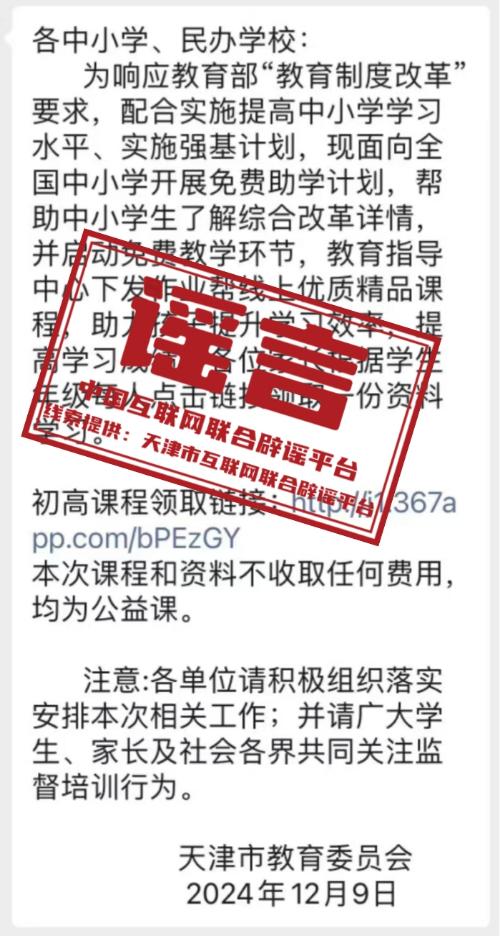 真相:近期,一则署名为“天津市教育委员会”的信息在网上传播,信息中提及“开展免费助学计划”“启动免费教学环节”“下发线上优质精品课程”“各位家长根据学生年级点击链接领取资料”等相关信息。经天津市教委核实,该信息非天津市教育委员会所发,相关信息不实。请广大网民切莫轻信、点击信息中链接,以免上当受骗。(来源:“天津辟谣”微信公众号)