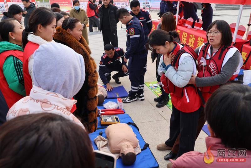 近日,在商丘好人广场,市红十字会工作人员指导过往市民体验模拟心肺复苏,现场普及海姆立克急救法等急救知识,让大家更加直观地了解如何在紧急情况下挽救生命。记者 邢栋 摄