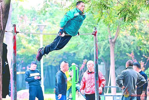 前日早晨,在京港绿地,几名健身“达人”正在体育器械旁健身,精湛的单杠技巧、稳健的动作、淡定从容的姿态,无不展现着健康和活力。本报融媒体记者 魏文慧 摄