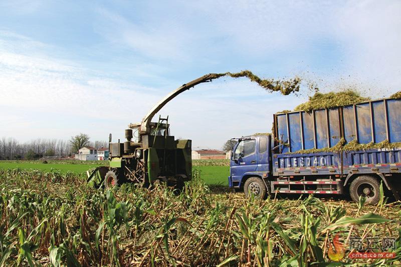 在王楼村西侧,农田到堆场间行驶的青贮货车排成了长龙。高粱田内,高粱穗收割完毕,余下90厘米许的高粱秆及叶依旧苍翠。多台青贮收割机穿行其中,不断“吞入”高粱秸秆,粉碎后向侧后方的青贮货车车厢内“吐出”秸秆碎末。随后,秸秆碎末拉往堆场卸下,经打捆机扯撕、去土、打捆等工序,最终成为一捆捆30余公斤的方形秸秆垛。