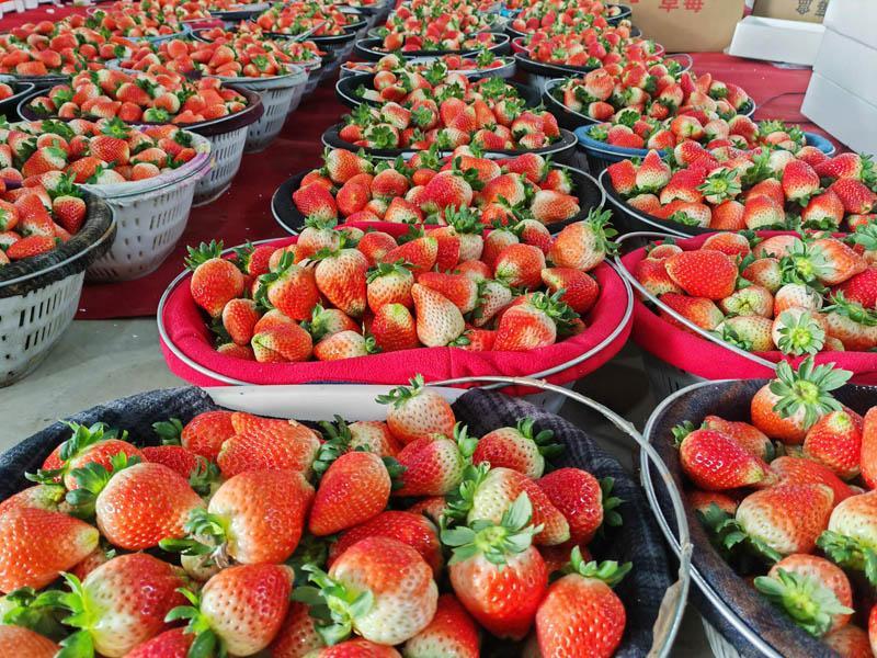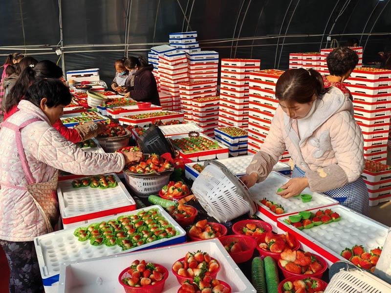 12月15日,梁园区双八镇王店村天泽草莓代收点,工人正在分拣草莓发往全国各地。眼下,双八镇草莓开始上市。色彩鲜艳、香气浓郁、口感香甜的草莓吸引着各地经销商前来采购。小小草莓连天加夜被销往天津、上海、河北等全国各地。