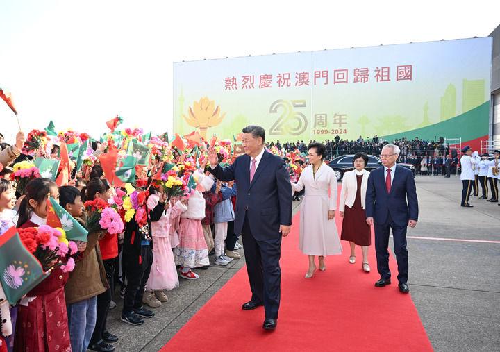 12月20日下午,中共中央总书记、国家主席、中央军委主席习近平圆满结束在澳门的各项活动,乘专机离开澳门。这是习近平和夫人彭丽媛向欢送人群挥手致意。新华社记者 谢环驰 摄 新华社澳门12月20日电(记者赵博、郭雨祺)中共中央总书记、国家主席、中央军委主席习近平圆满结束在澳门的各项活动,20日下午从澳门乘专机返回北京。 习近平于12月18日下午抵达澳门。在澳门期间,习近平出席了庆祝澳门回归祖国25周年大会暨澳门特别行政区第六届政府就职典礼,以及澳门特别行政区政府欢迎晚宴和庆祝澳门回归祖国25周年文艺晚会;会见了何厚铧、崔世安、贺一诚、岑浩辉,以及澳门特别行政区行政、立法、司法机构负责人,澳门特别行政区纪律部队代表,澳门社会各界代表人士;看望了中央驻澳机构和主要中资机构负责人;视察了驻澳门部队;考察了澳门科技大学和横琴粤澳深度合作区,同澳门民众广泛接触和交流。习近平还会见了前来参加庆祝活动的香港特别行政区行政长官李家超。 欢送仪式上,澳门少年儿童向习近平和夫人彭丽媛献上鲜花。习近平和夫人彭丽媛同前来送行的人员一一握手,向欢送队伍挥手道别。 蔡奇、李鸿忠、何卫东、何立峰、王东峰等同机离开澳门。
