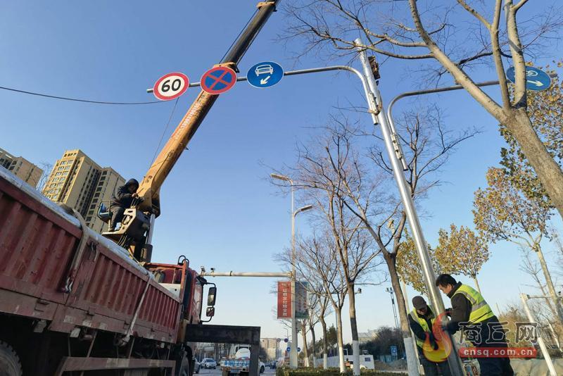 12月22日,在归德路与北海路交叉口南侧,工人正在安装限速标识。随着春节临近,出行车辆较多,为了安全,请勿超速驾驶。